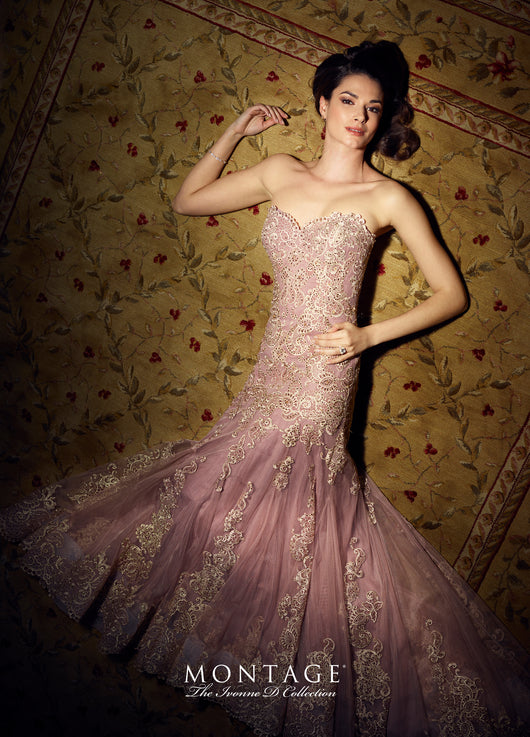 Robe sans bretelles en tulle et en dentelle métallisée avec décolleté en cœur, corsage en dentelle à taille basse, ourlet festonné avec crin de cheval, train de balayage. Châle assorti et bretelles amovibles inclus