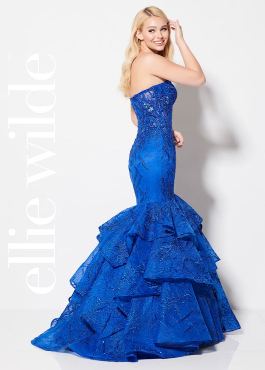 Strapless embroidered tulle mermaid gown with a sweetheart neckline, corset bodice, natural waist, tiered skirt with a horsehair hem and stone accents throughout.