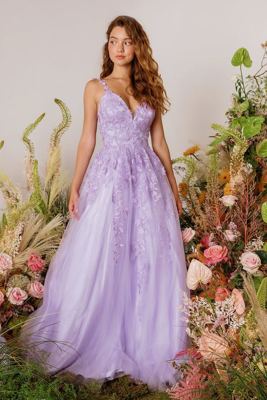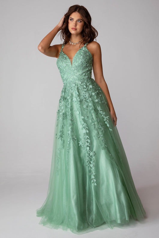 Elegant and lovely prom dress with 3D lace embroidery adorning the bodice and cascading to the A-line mesh glitter shimmer underlay skirt. The v-neckine dress finishes with a corset back.