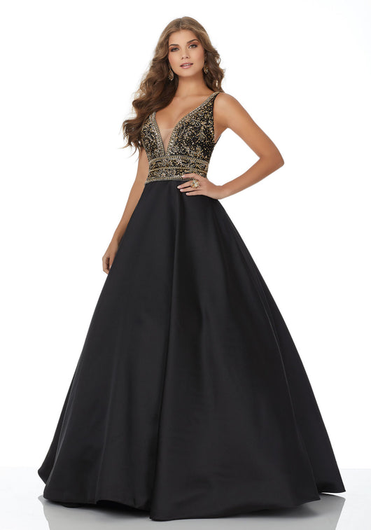 Sleek Larissa Satin Ballgown with Plunging V-Neckline and V-Back. Gold Beaded Details on Bodice Complete the Look. Colors Available: Champagne/Gold, Black/Gold