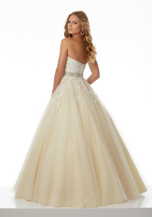 Sweet and Romantic Tulle Ballgown Featuring a Beaded Lace Bodice and Beaded Waistband.