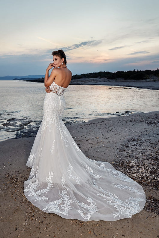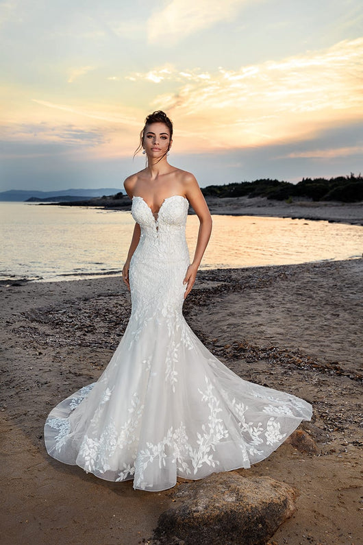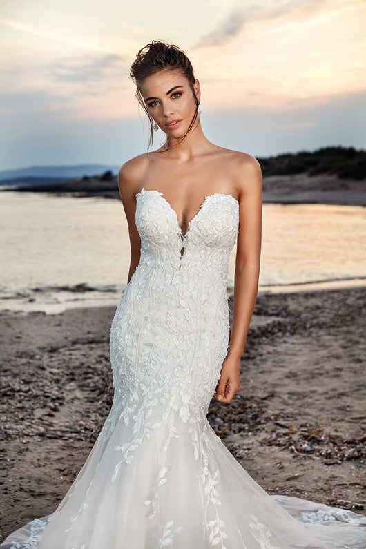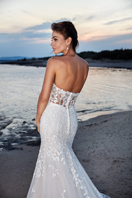 A sweetheart strapless wedding gown featuring 3D flowers bodice