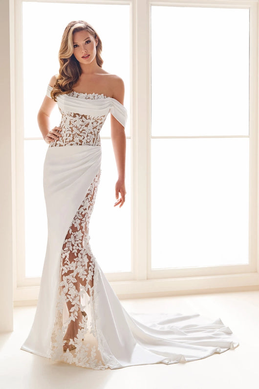 Make an unforgettable entrance in this glamorous fit and flare gown. Featuring a stylish curved neckline with elegant draped sleeves and a semi-sheer illusion bodice, this flattering gown strikes the perfect balance between romance and seduction.
