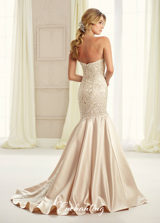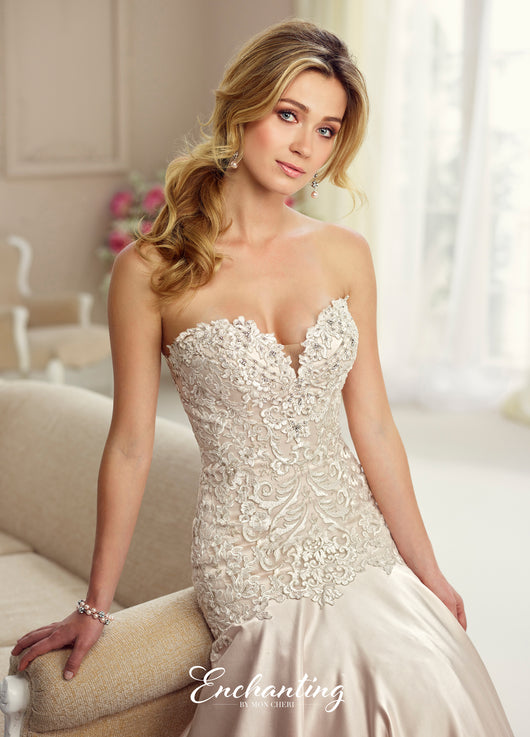 Robe en satin et dentelle sans bretelles, encolure en cœur échancrée avec illusion de modestie, corsage en dentelle perlée à la main avec taille tombante, boutons recouverts de corsage et cascade jusqu'au bas de la robe. Sangles amovibles incluses