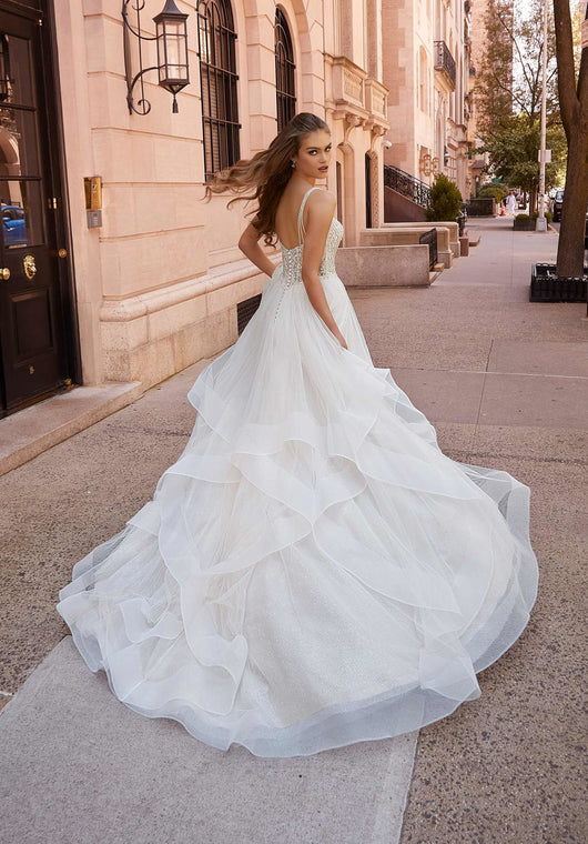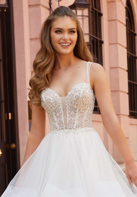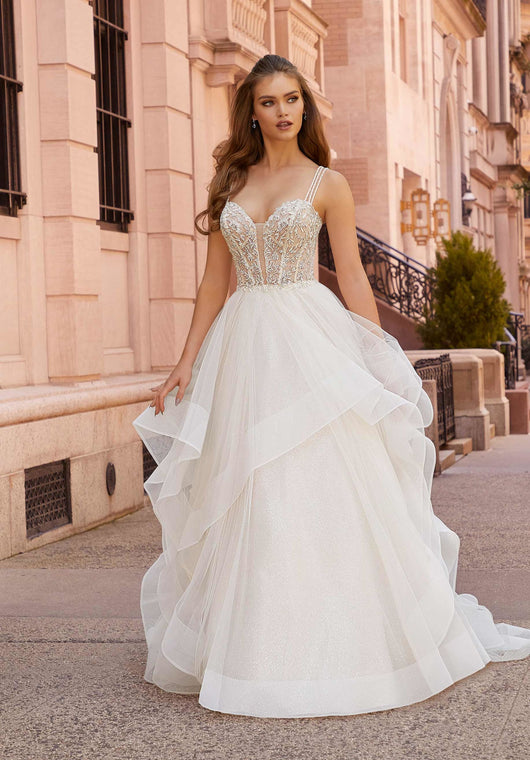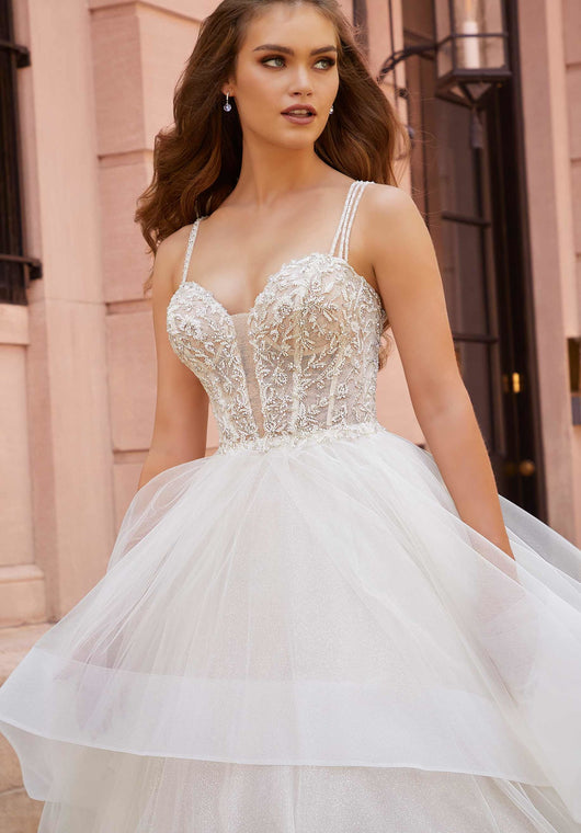 Fairytale ball gown has a sheer bodice with dazzling beading and triple beaded straps on a full flounced skirt with tons of texture.