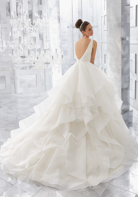 Light and Airy, this Stunning Flounced Organza Ball Gown with Wide Horsehair Edging Features a Plunging V-Neck and Open V-Back. Illusion Insets Along Sides . Colors Available: White, Ivory, Ivory/Stripe. Shown in Ivory, and Ivory Stripe.