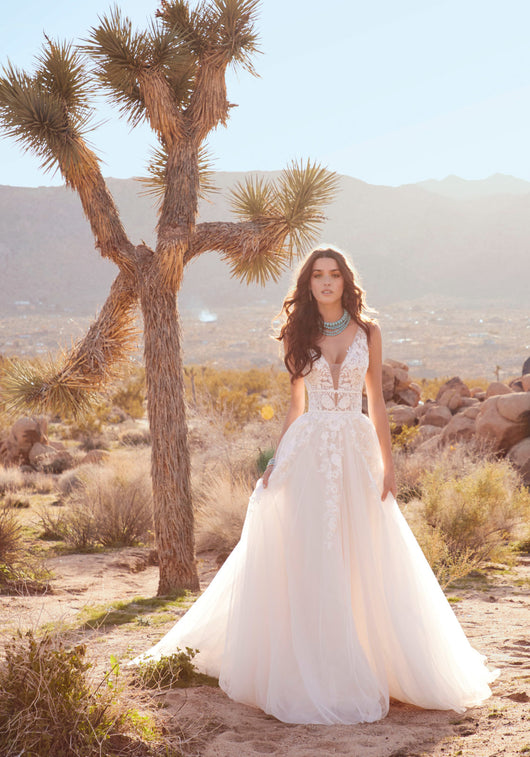 Crystal Beading on Frosted, Embroidered Lace Appliqués on Net with Satin Waistline Trim on a Soft Net, A-Line Godet Skirt with Lace Trimmed Train