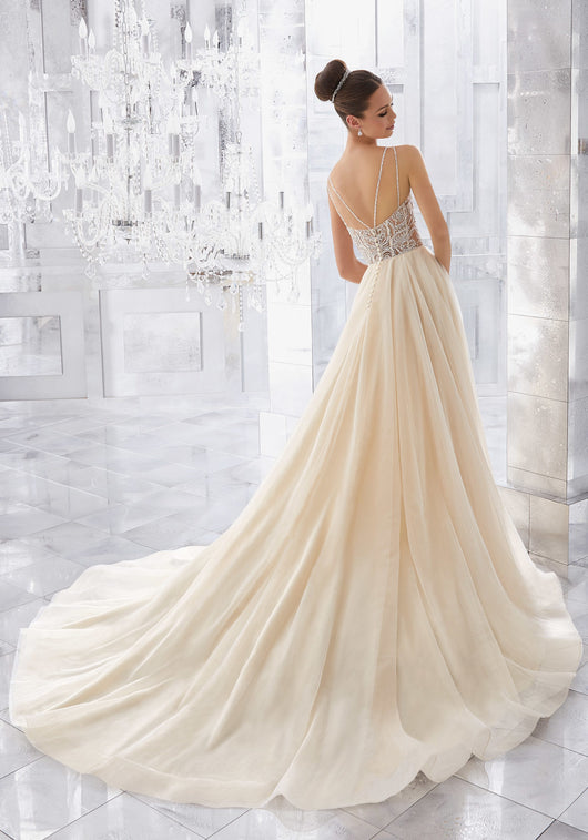 Douce et éthérée, cette robe douce et soyeuse contient un cristal éclatant et un corsage diaphane perlé de diamant avec dos exposé. Les bretelles délicates double complètent le look. Doublure de corsage en satin assortie incluse.