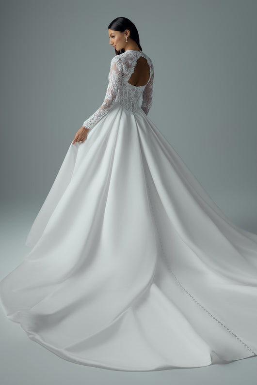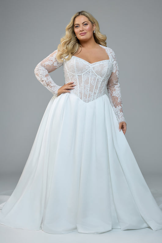 Majestic from every angle, Sabrina is a modern ball gown with undeniable presence. Her structured corset bodice features exposed boning and is crafted from regal overlace, complemented by a detachable lace jacket. Her mesmerizing sleeves create an eye-catching keyhole back detail that’s as striking as it is romantic. A sweetheart neckline softens the silhouette, while her satin ball gown skirt brings both volume and contrast to the textured bodice. A concealed thigh-high slit adds a daring touch, offering ease of movement and the option for a dramatic reveal. With or without her sleeves, Sabrina is a gown that commands attention.