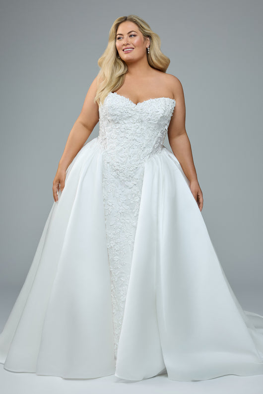 Brides, meet Sasha: a gown that wraps grandeur and bold detail into one unforgettable silhouette. Her strapless sweetheart neckline is adorned with delicate pearls, 3D lace, and shimmering sequins, while sheer side panels add a modern touch of allure. Pearl buttons trail down the back bodice, continuing all the way to the hem of her sweeping train. A standout feature, the bodice flows seamlessly into a contrasting front skirt panel that breaks the satin volume with subtle drama and texture. This gown balances timeless elegance with striking, refined design. Sasha is guaranteed to turn heads and leave the lasting impression you desire!