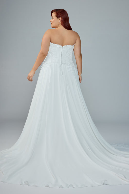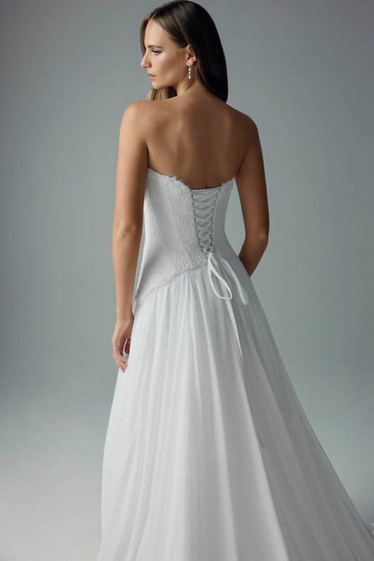 Designed for high-impact entrances, Sirena delivers grandeur with an editorial edge. With a sculpted satin bodice and a voluminous ballgown skirt that feels almost alive, this dress was made for brides who want to take up space in the most unforgettable way. The popular scoop neckline adds bold softness, while sheer side panels with illusion boning bring structure and edge. A lace-up back completes the look with classic corsetry detail and an ultra-flattering finish. Her skirt features carefully placed pickups throughout, creating movement, depth, and undeniable drama with every step. Part princess, part runway: Sirena is where high fashion meets modern fairytale.